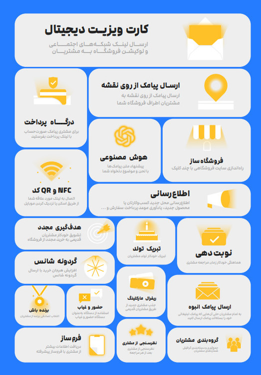 بلافاصله بعد از ورود شماره موبایل، کارت ویزیت دیجیتال تان را برای مشتری پیامک کنید تا مشتری با یک کلیک بر روی لینک اینستاگرام جزو فالورهای پیج شما باشد. بعد از آن مشتری را طوری که دوست دارید دسته بندی کنید تا در آینده ارتباط بهتری با او داشته باشید. چند ساعت یا چند روز بعد هم از مشتری بابت خریدی که داشته است نظرسنجی کنید. در روز تولد مشتری هم تولدش را تبریک بگویید! دفعه بعدی که به شما مراجعه کرد با گردونه شانس یک مسابقه جذاب و هیجان انگیز برایش بسازید. حتی می توانید برای او صورت حسابی بفرستید تا اینترنتی آن را پرداخت کند.